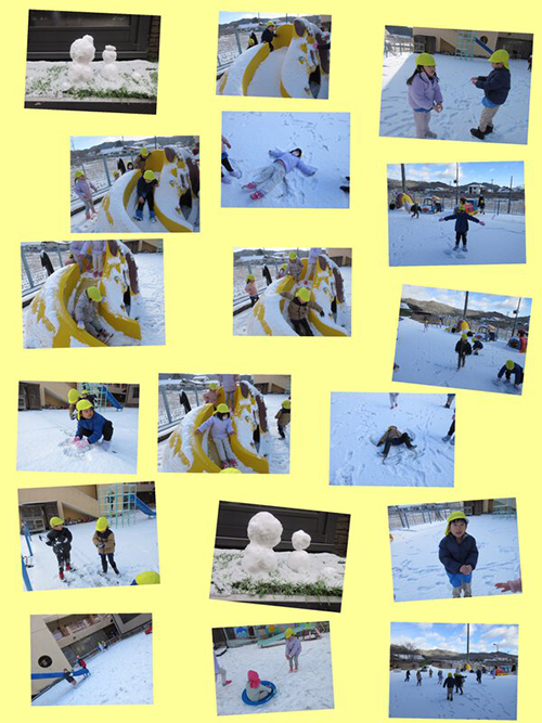 真っ白な園庭に走り込んで触ったり雪合戦したり。大きな雪だるまは作れませんでしたが、かわいいサイズの雪だるまを作りました。