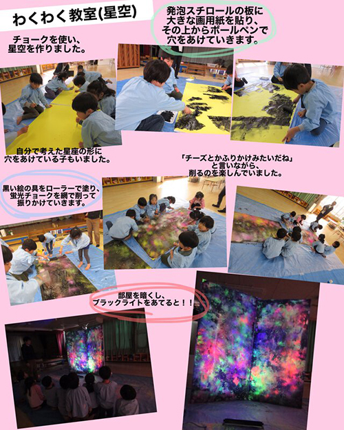 年長さくら組ではわくわく教室があり、大きな星空をチョークで作りました。穴をあけたり、絵の具を塗ったり、チョークを削ったり、色々な工程を経て、ブラックライトを当てると!!!