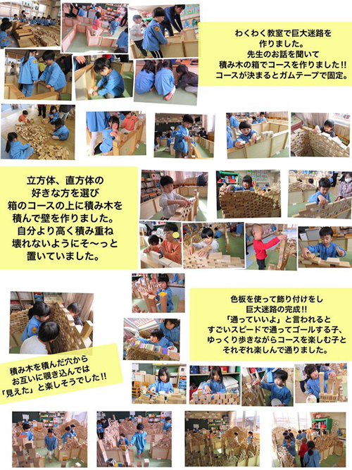 ばら組のわくわく教室では、みんなで巨大迷路づくりに挑戦しました。積み木の空き箱でコースを作り、その上に立方体や直方体の積み木を積み重ねて壁を作りました。自分の背丈ほど高く積む子や、崩れても何度も作り直す子など、友だちと話し合いながら力を合わせて取り組む姿が見られました。完成した迷路ではコイン探しを楽しみ、夢中になって丸い色板を探す子どもたちの笑顔が広がっていました。