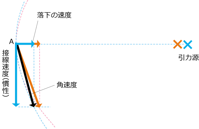 結果として引力は角速度に含まれてしまいます、角速度は短い時間であれば 引力源からは 90度 横を向いています。