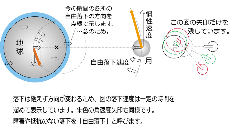 宇宙に浮いている地球と月が周回を続けられるのは、角速度以外の運動をしていないからです。また、楕円の公転があっても復元して周回が続くのは、その間に如何なる矢印(黒)も存在していないからです。