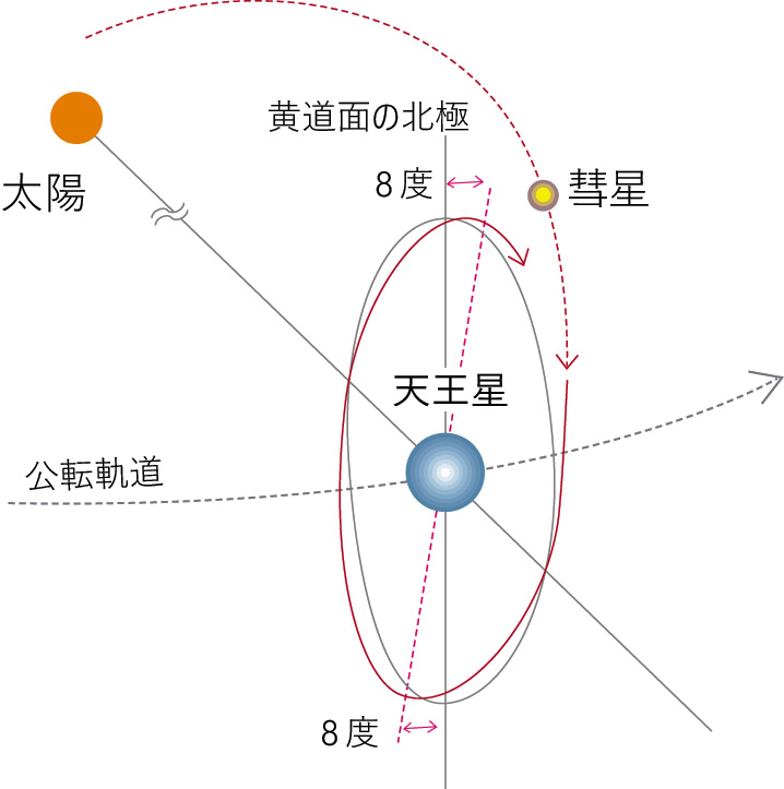 この彗星が太陽を周回する道筋と、天王星の公転軌道とが、直角交差するのであったなら、いつかきっと出会うことになります。