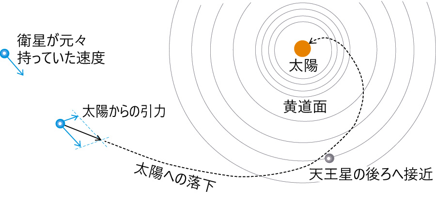 天王星は、近づいてきた天体に引力作用を与え続けます。青の点線矢印で示しています。これにより、衛星の速度は周回する角速度に生まれ変わり、天王星とつり合います。